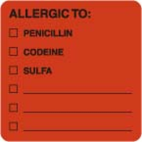 Allergy Warning Labels, ALLERGIC TO: - Fl Red 2" X 2" (Roll of 250)
