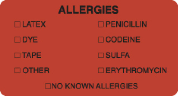 Allergy Warning Labels, ALLERGIES - Fl Red, 3-1/4" X 1-3/4" (Roll of 250)